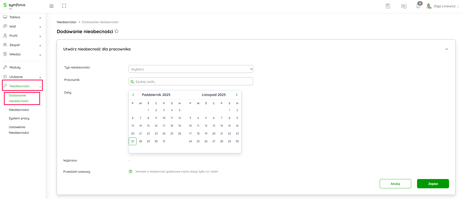 - Przejdź ścieżkę Moduły → Nieobecności → Dodawanie nieobecności.