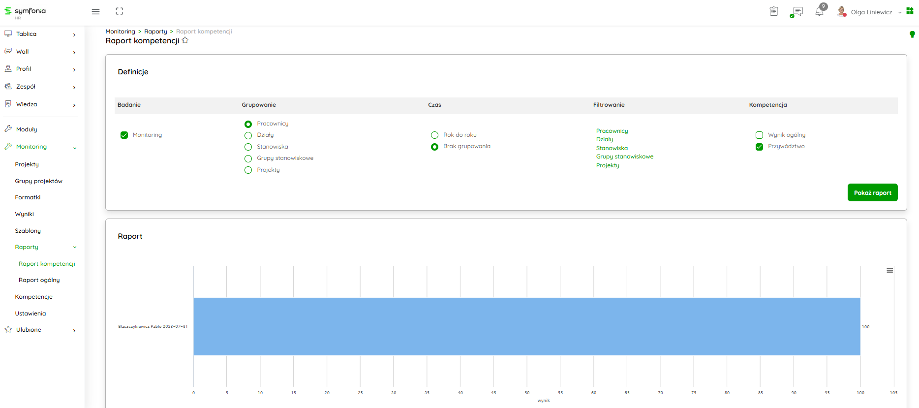 Wygenerowany Raport Kompetencji jest przedstawiony w formie wykresu z możliwością filtrowania