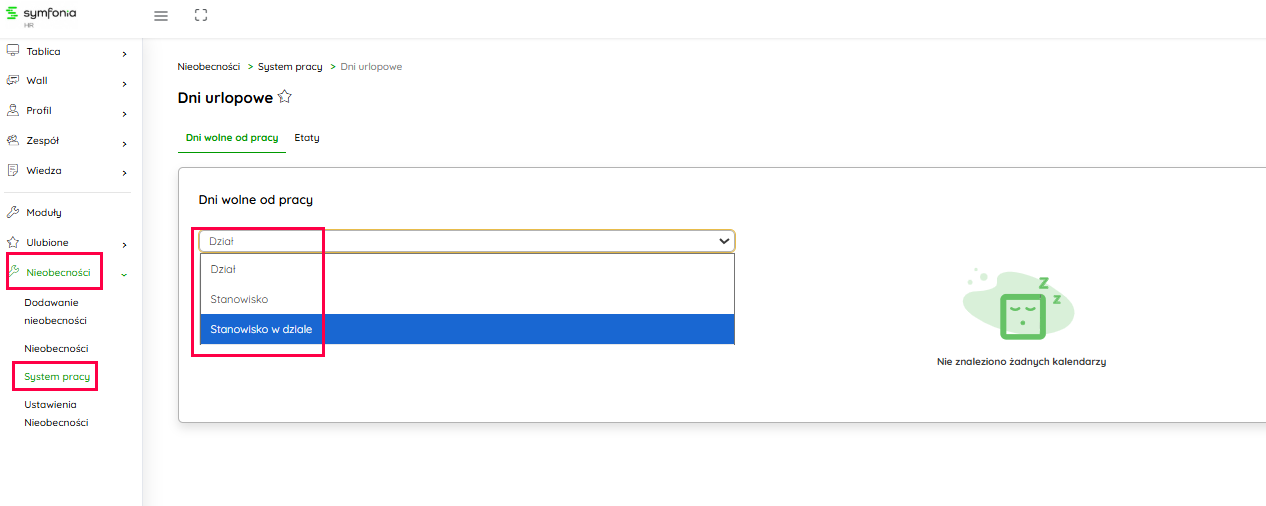 Jeśli w Ustawieniach nieobecności/ System (czasu) pracy, został w firmie utworzony kalendarz dni wolnych przypisany dla konkretnych działów, stanowisk bądź stanowisk w dziale można to łatwo zweryfikować w systemie. Dzięki zawartym informacjom dowiesz się, gdzie to sprawdzić oraz jak dodać taki specyficzny kalendarz.