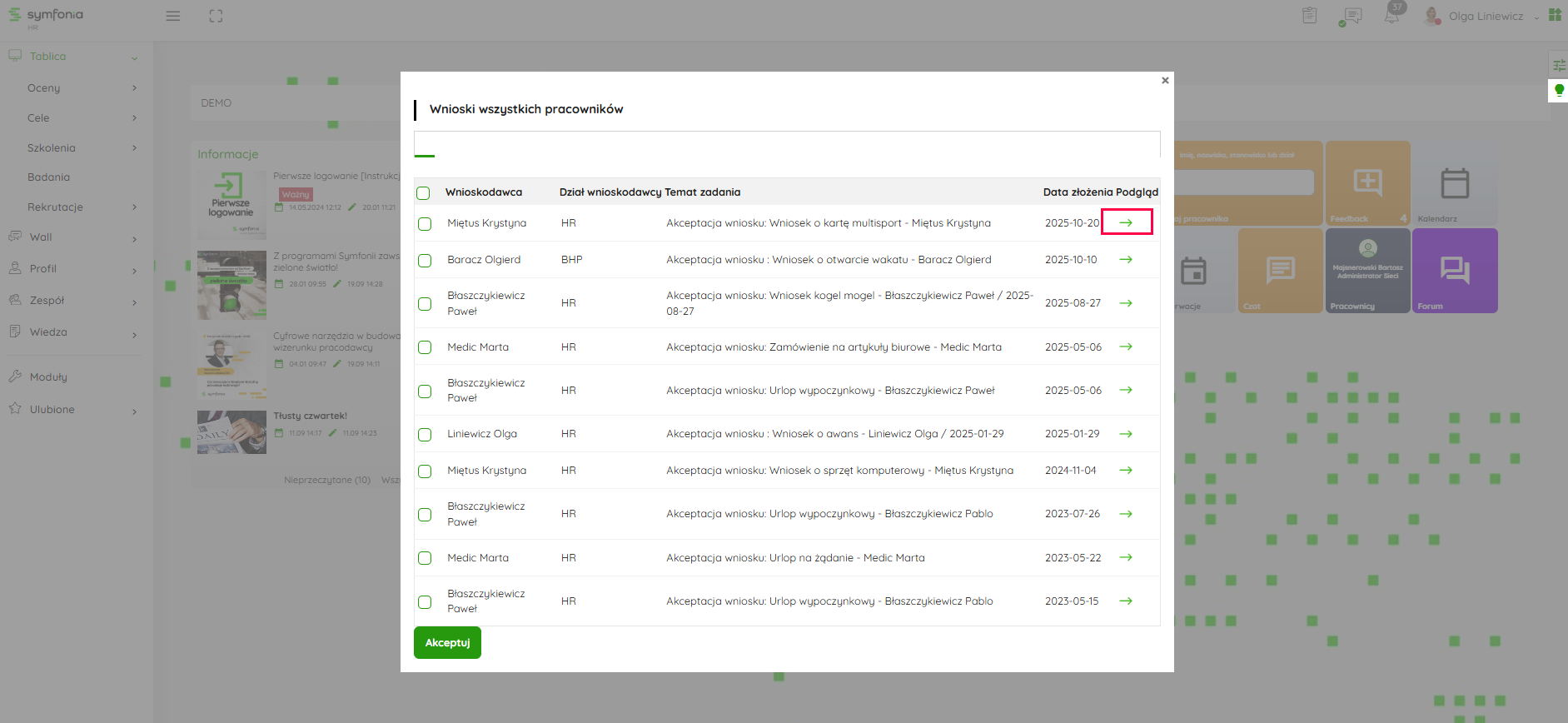 Drugim sposobem akceptacji wniosku jest wejście w kafelek Akceptacja wniosków, po kliknięciu w kafelek na wybranym wniosku należy wejść w podgląd wybierając zieloną strzałkę