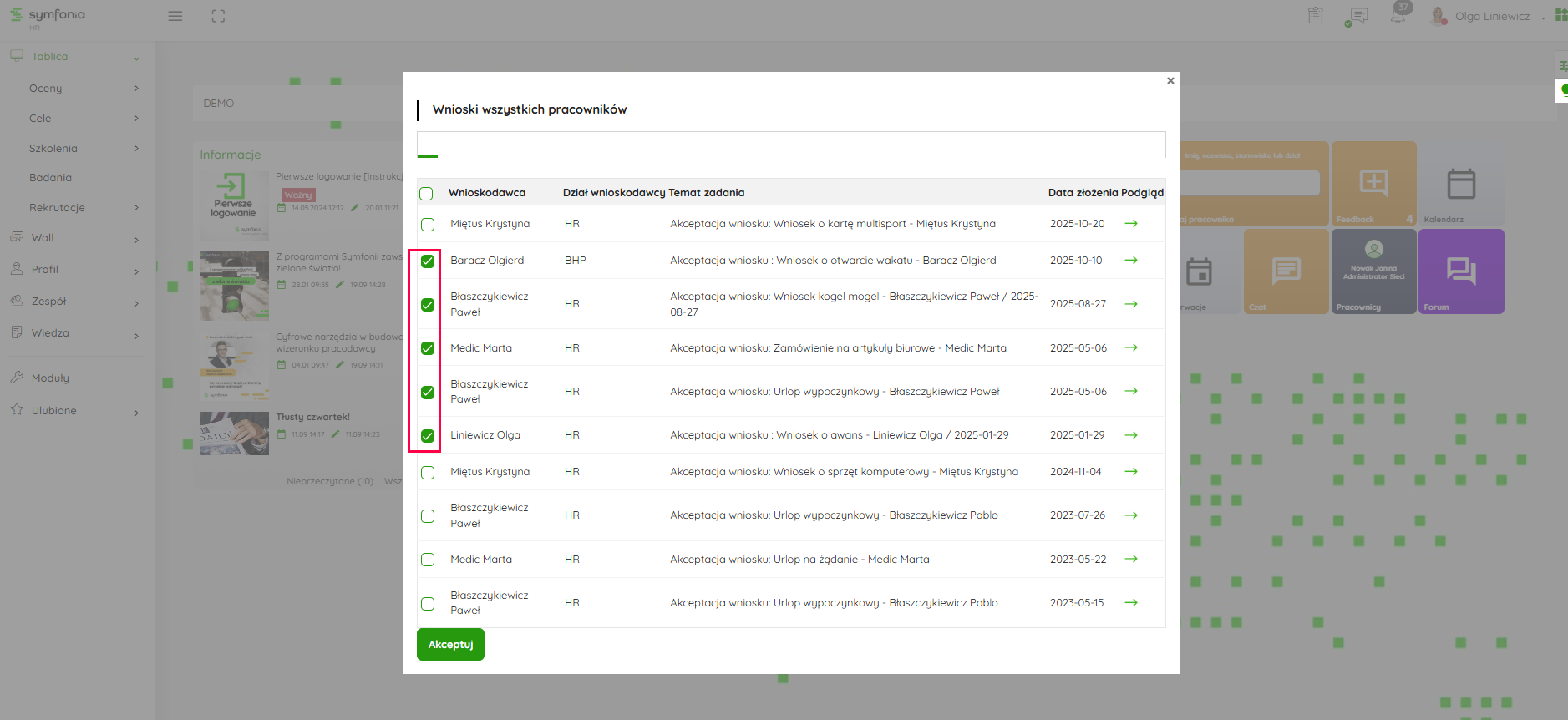 - lub kafelka dedykowanego wnioskom – Akceptacja wniosków.