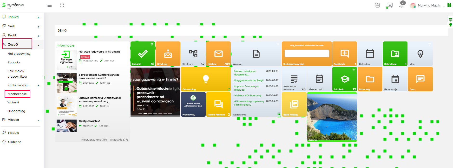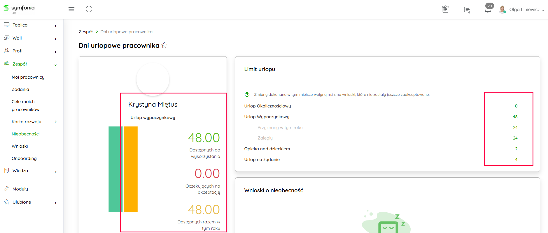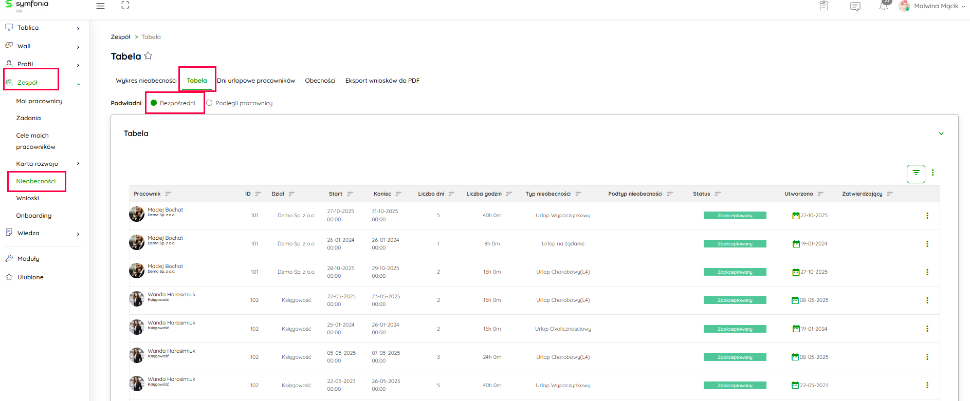 Aktualne, jak i archiwalne dane dotyczące nieobecności pracowników, znajdziesz w menu bocznym, po wybraniu ścieżki Zespół → Nieobecności.