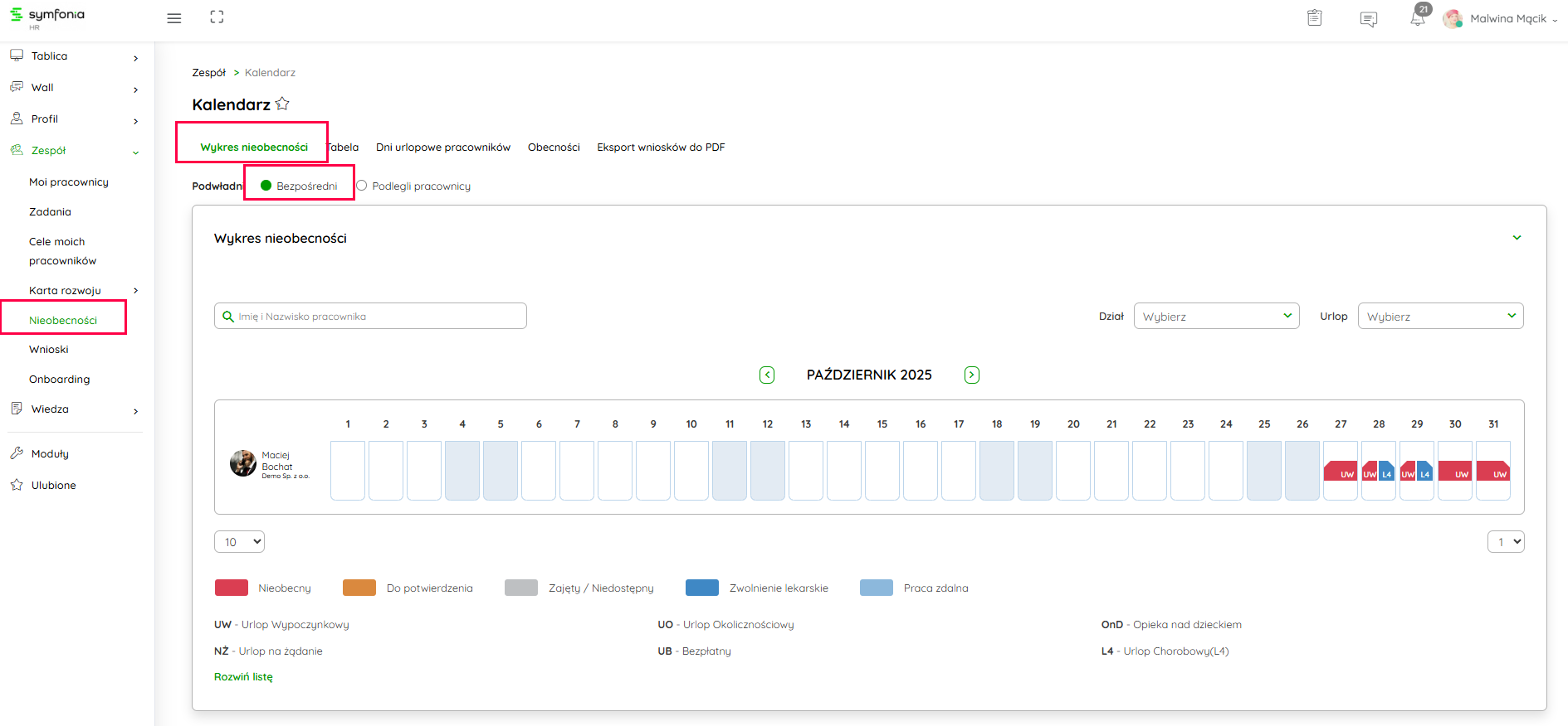 Kalendarz Znajduje się pod ścieżką Zespół → Nieobecności → Wykres nieobecności.Po zaznaczeniu opcji Bezpośredni sprawdzisz nieobecności swoich pracowników, których jesteś bezpośrednim przełożonym.