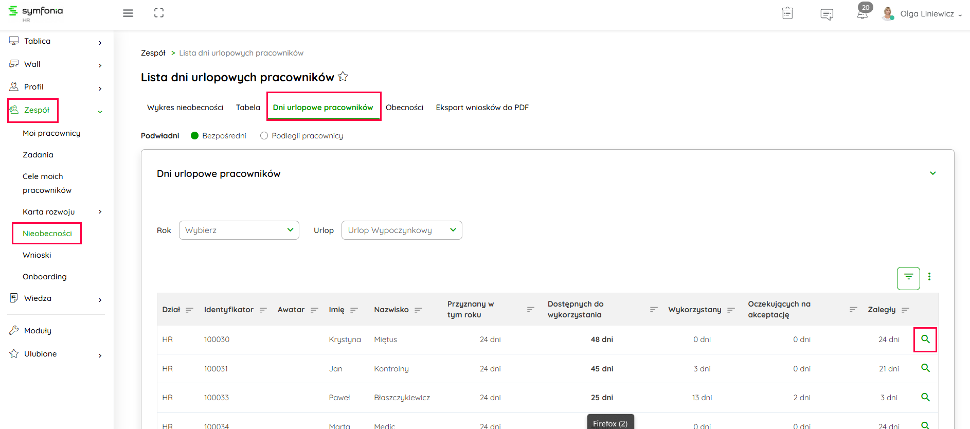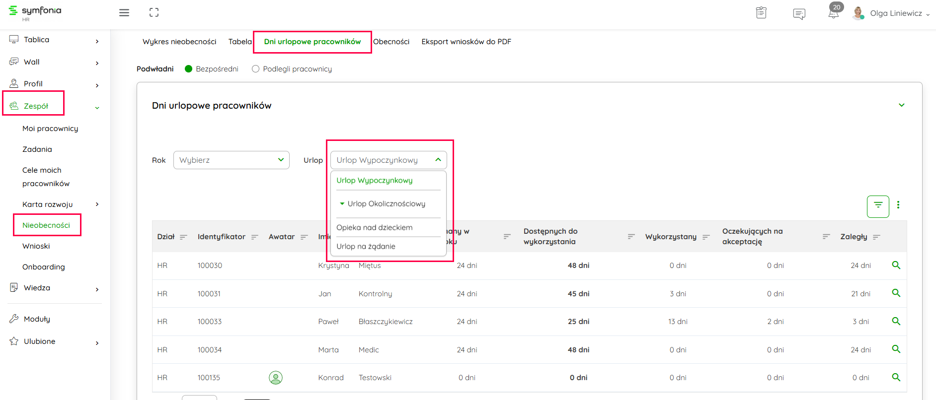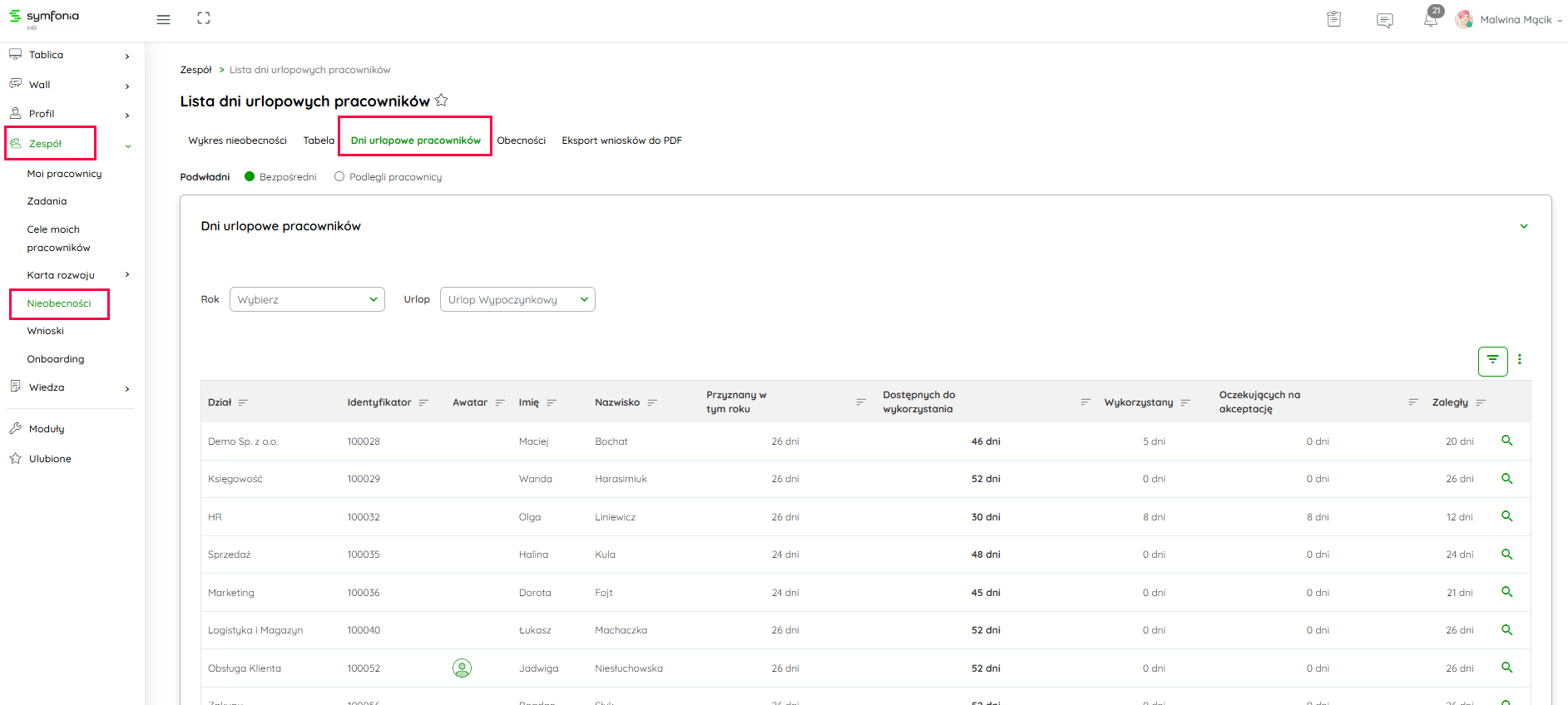 Kliknij na obraz, żeby powiększyć Po zaznaczeniu Podlegli pracownicy znajdziesz informacje na temat nieobecności wszystkich pracowników, którzy są w strukturze podlegli Twojej osobie.