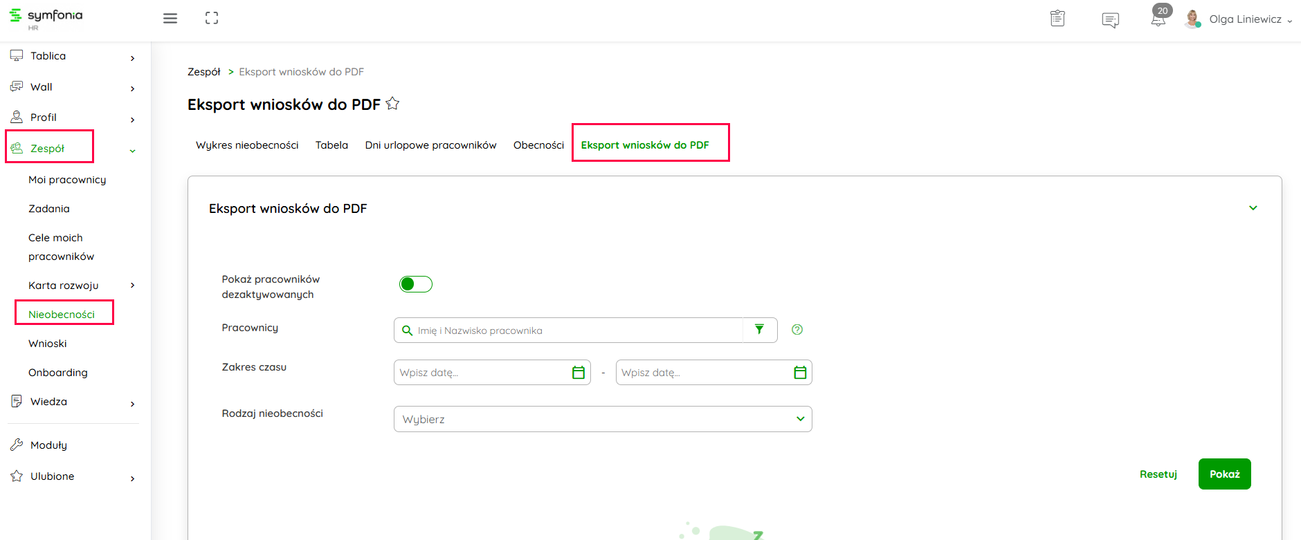 W ostatniej zakładce masz możliwość wyeksportowania dowolnego typu wniosku do PDF dla wszystkich pracowników swojego zespołu.