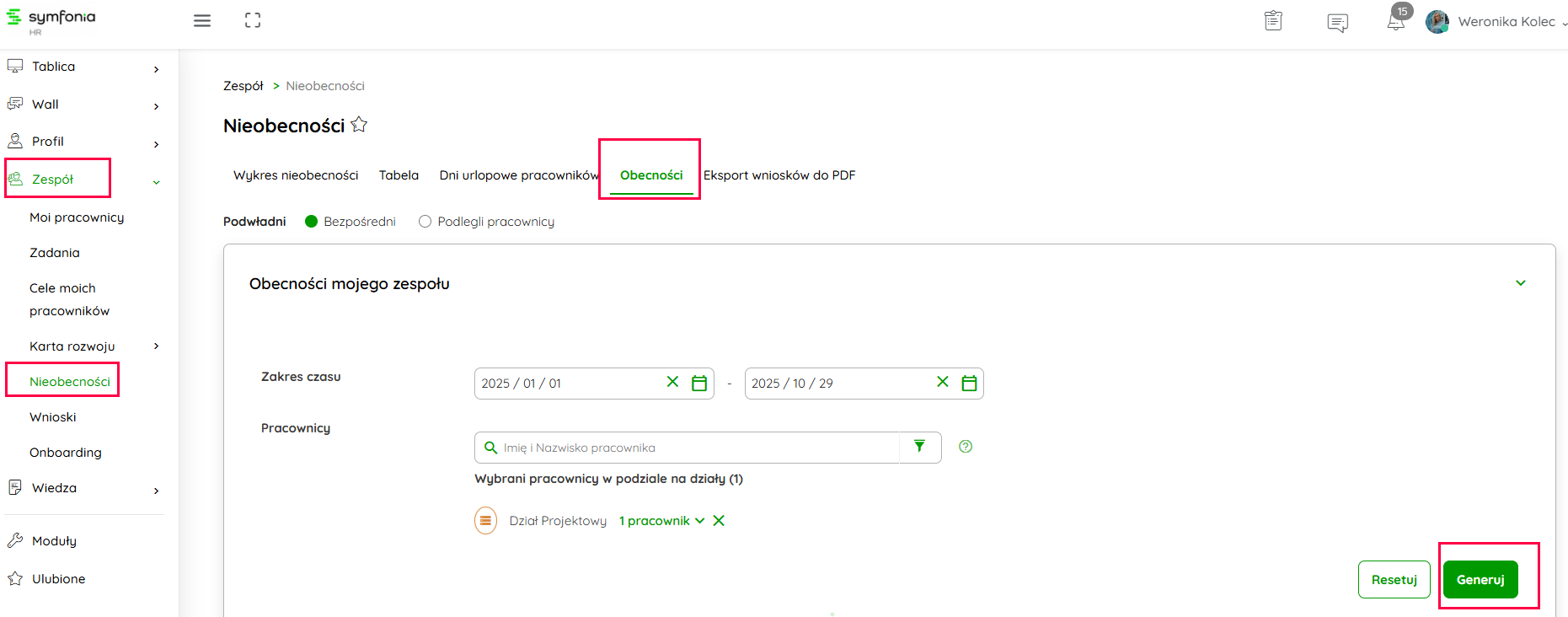 Znajduje się pod ścieżką Zespół → Nieobecności → Obecności.