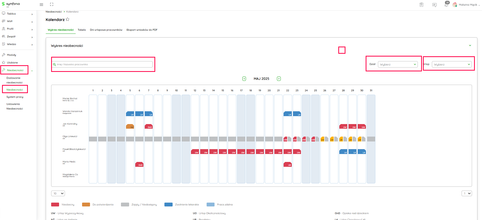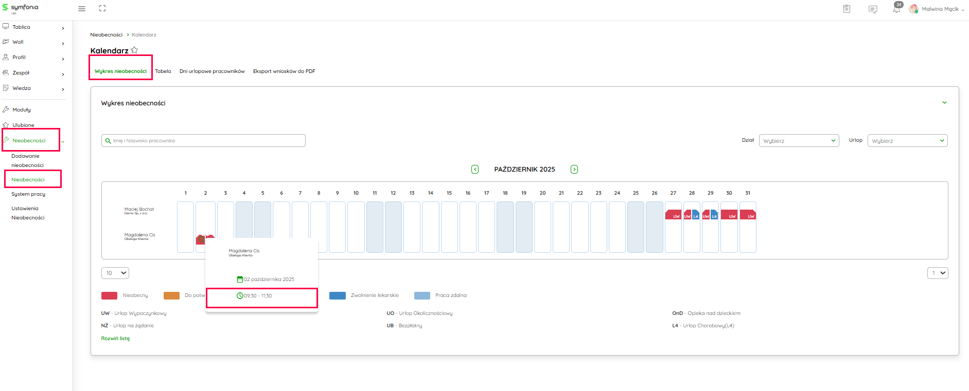 Kliknij na obraz, żeby powiększyć Pod widokiem Wykresu nieobecności, znajdziesz również legendę tłumaczącą zarówno zastosowane na widoku kolory, jak i ikonki widoczne na każdej z pobranych nieobecności. Dostęp do pełnej listy znajdziesz, po kliknięciu w przycisk Rozwiń listę.