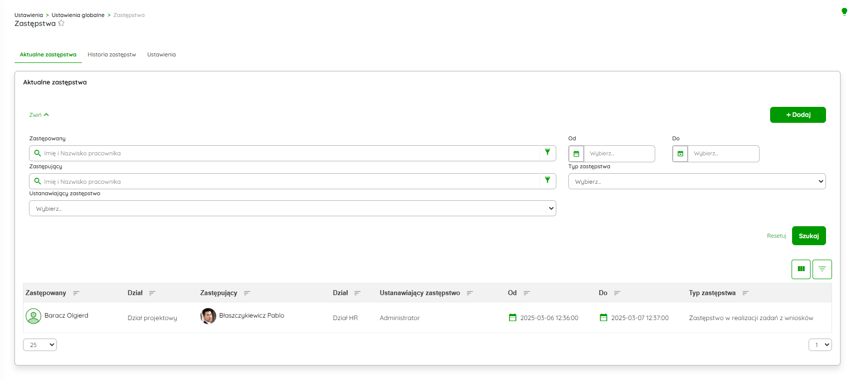 W zakładce Aktualne zastępstwa, uzyskasz podstawowe informacje na temat bieżących zastępstw. Znajdziesz tutaj takie dane jak: imię i nazwisko, z jakich są działów, osoba dodająca zastępstwo, przedział dat czy typ zastępstwa. Wyniki w tabeli możesz filtrować i sortować.