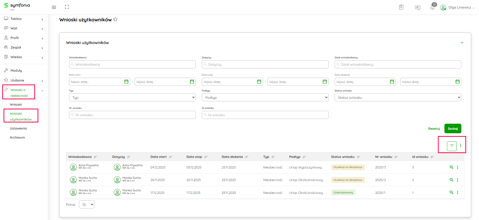 W tym miejscu znajdziesz również opcję filtrowania, po uruchomieniu której, możesz filtrować wnioski po tych samych polach, które są dostępne w tabeli oraz po dodatkowym polu Dział wnioskodawcy.
