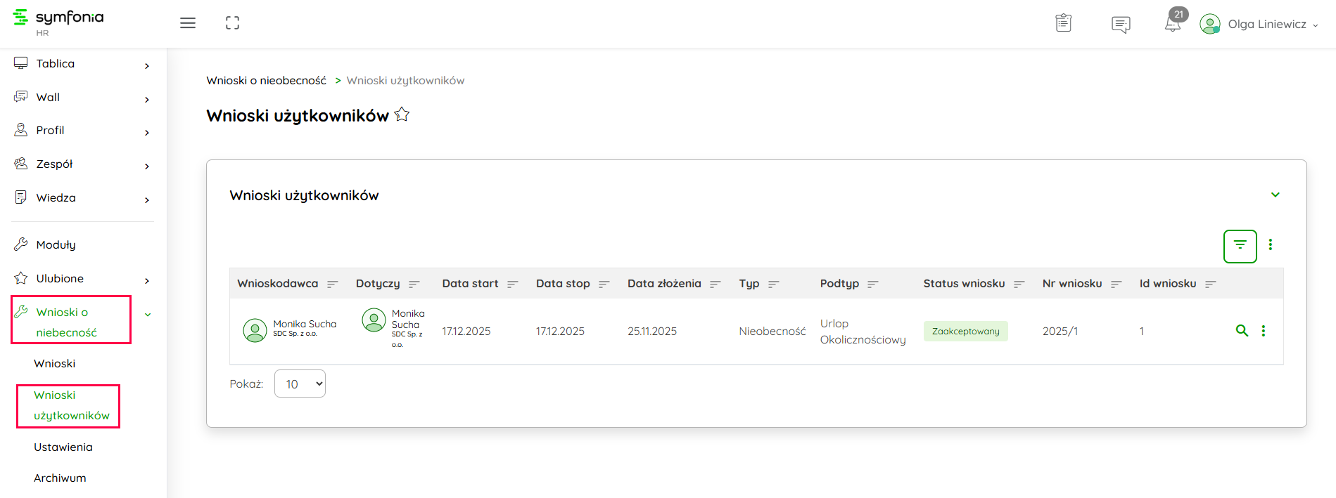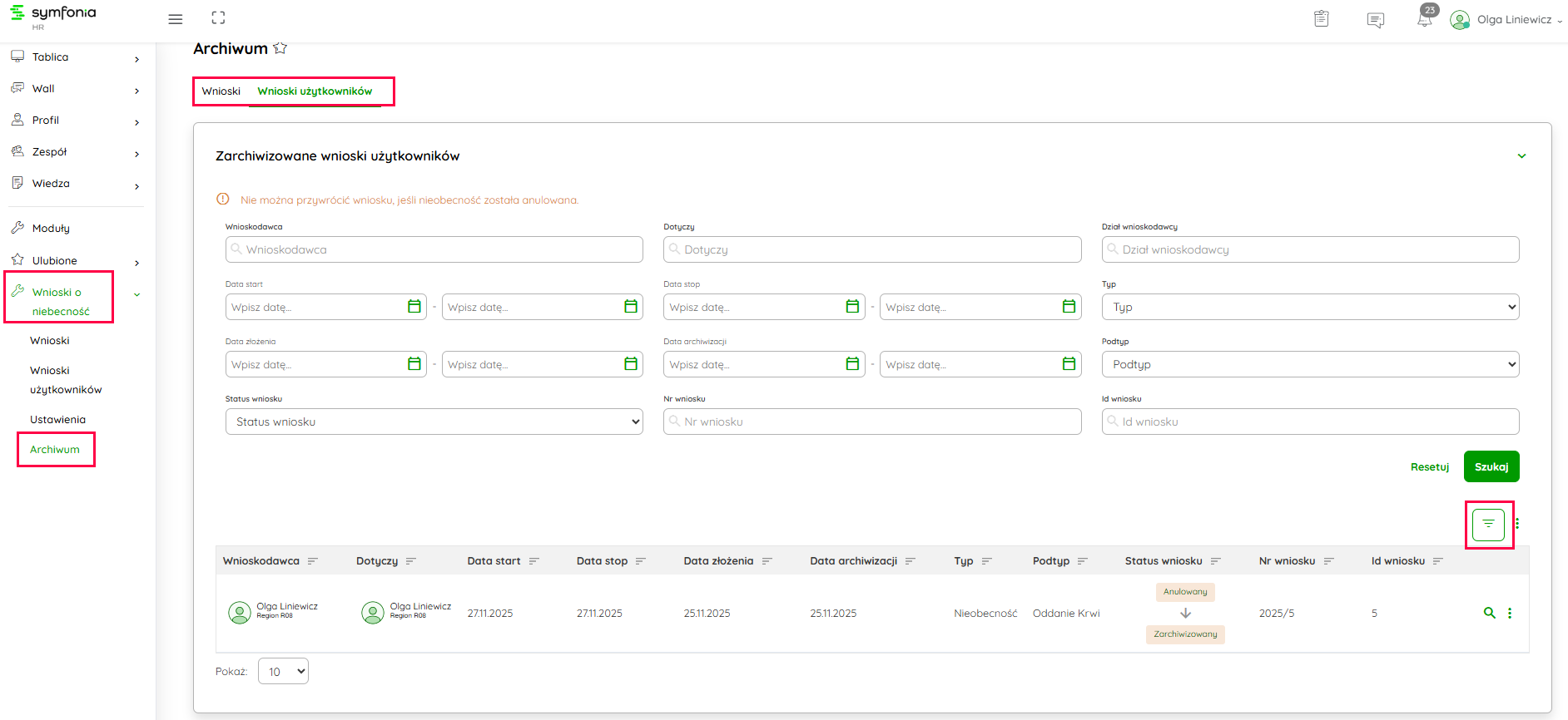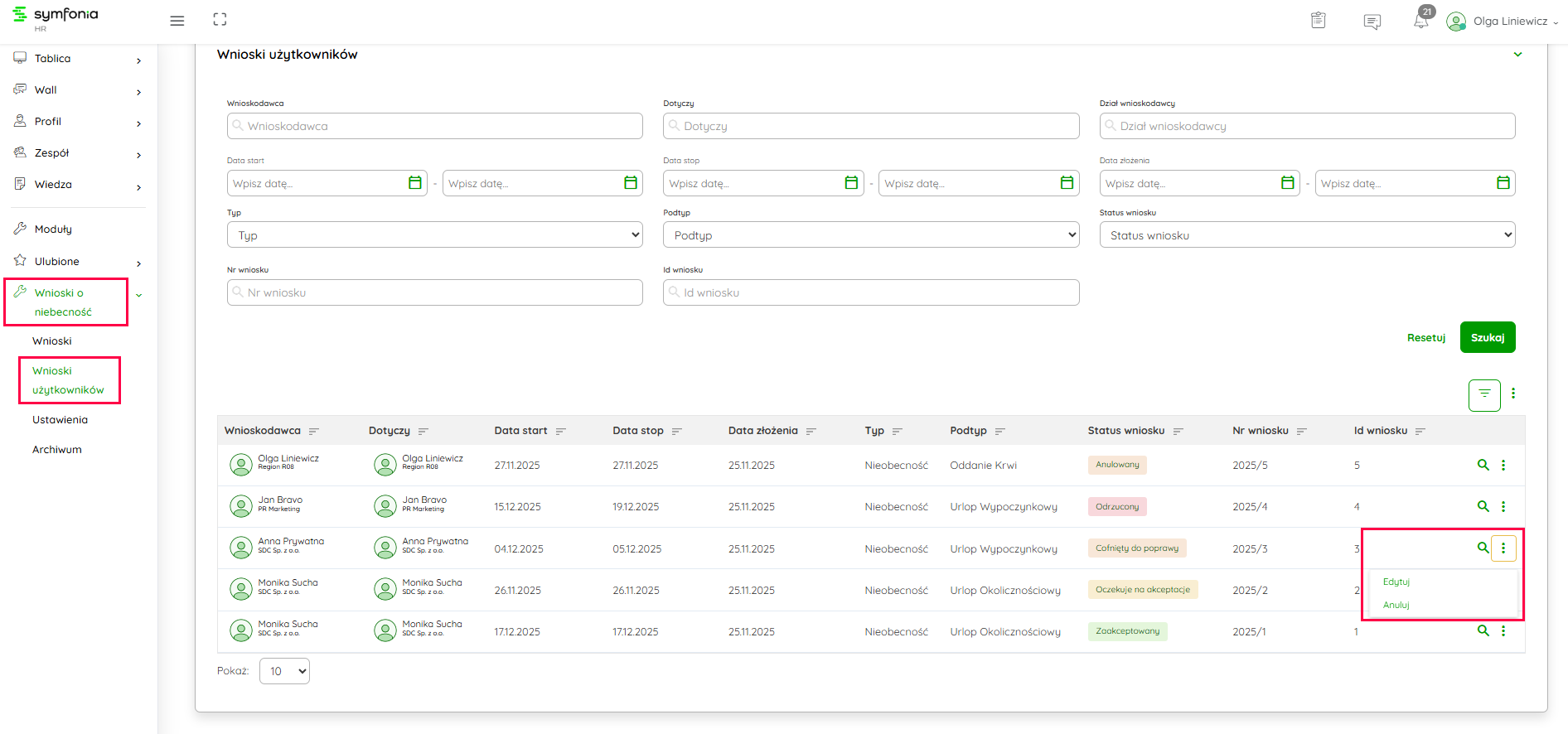 W tabeli Wnioski użytkowników możesz wejść w podgląd wniosku, a także w zależności od statusu możesz wnioski edytować, zarchiwizować lub anulować.
