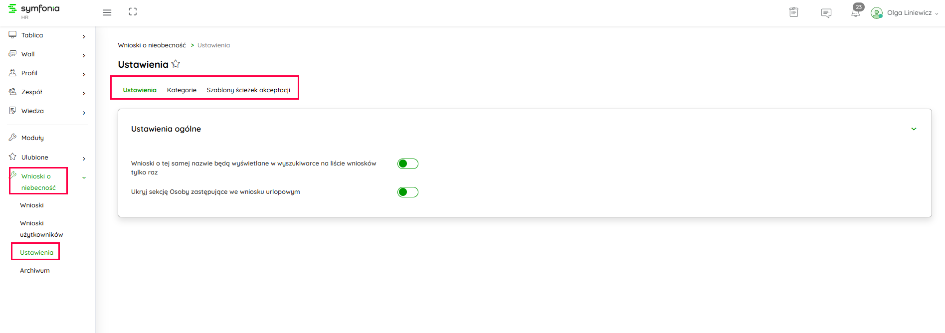 W zakładce Ustawienia znajdują się: Ustawienia oraz Kategorie, Szablony ścieżek akceptacji.