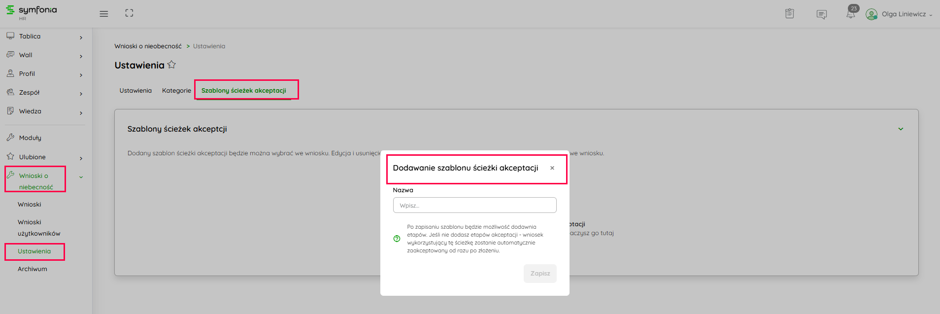 - dodajemy szablon ścieżki akceptacji, który będzie można wybrać we wniosku.