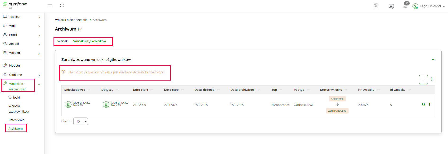 - Wnioski ze statusem : Anulowany, W trakcie anulacji, Oczekuje na akceptacje (dotyczy anulowania wniosku z pełną ścieżką) - możesz Zarchiwizować
