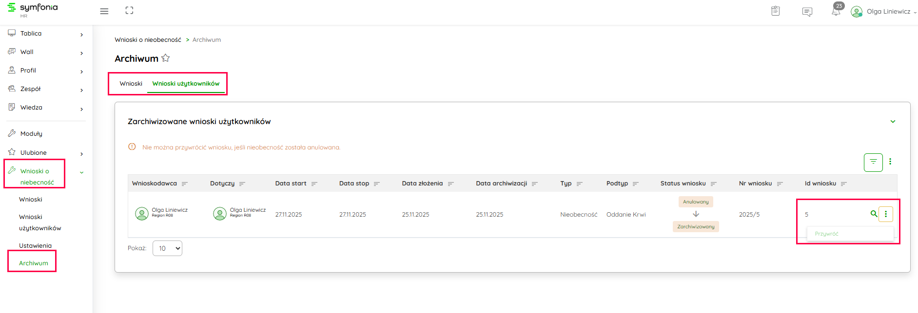 - Wnioski ze statusem Oczekuje na akceptacje, Zaakceptowany, Odrzucony - możesz Anulować lub Zarchiwizować