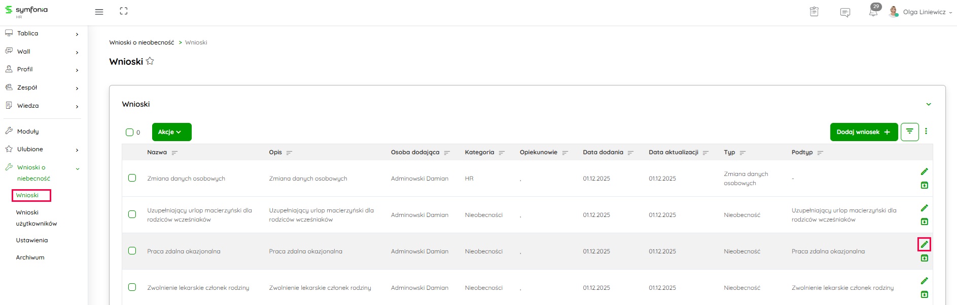 - Przejdź do Moduły → Wszystkie → Wnioski o nieobecność → Wnioski,