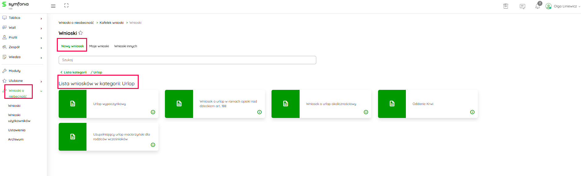 Po przejściu do zakładki Nowy Wniosek wyświetlą się kategorie a w nich wnioski. Widok Kategorii, można dezaktywować w Ustawieniach systemu. Dostępne wnioski zależą od dostępu przyznanego przez administratorów i są nadawane pojedynczo poprzez przypisanie. dla danego użytkownika.