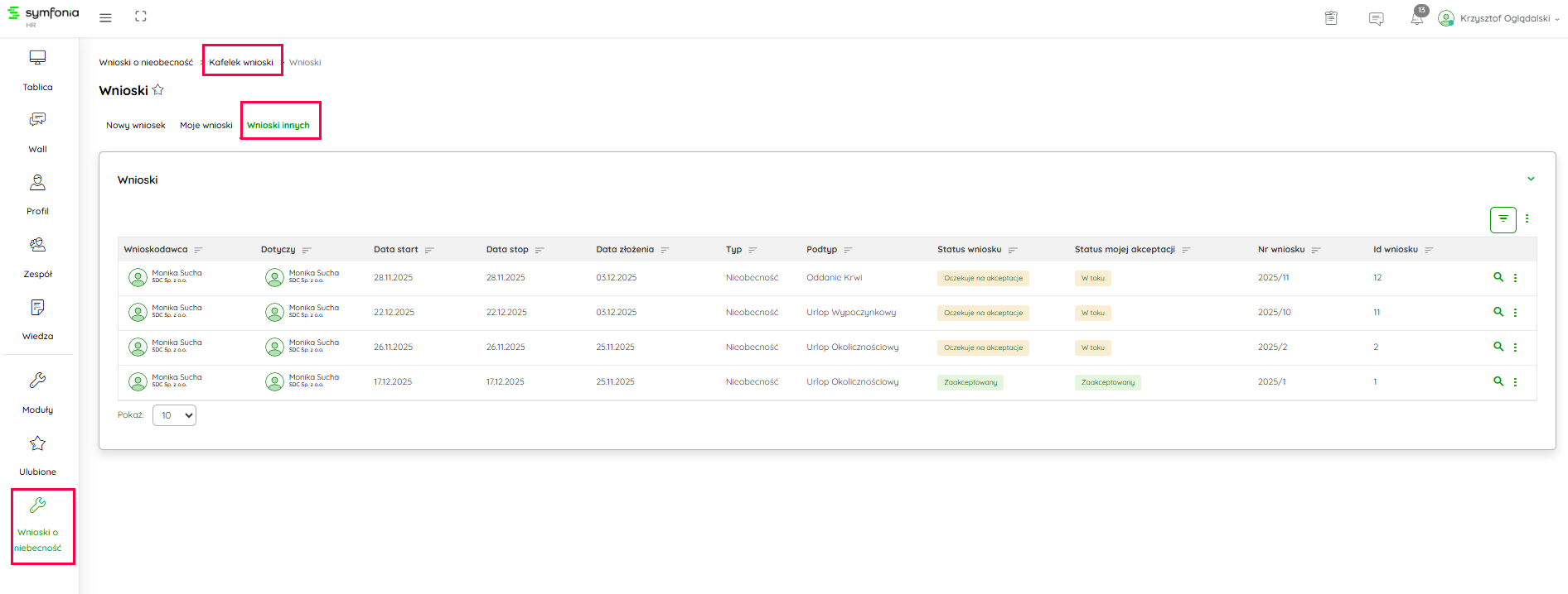 Na zakładce Wnioski innych, widnieje lista złożonych wniosków o nieobecność za innego pracownika. W tabeli widoczne są takie dane jak: Wnioskodawca, Dotyczy, Data start i Data stop, Data złożenia wniosku, Typ, Podtyp, Status wniosku, Status mojej akceptacji, Numer wniosku i ID wniosku.