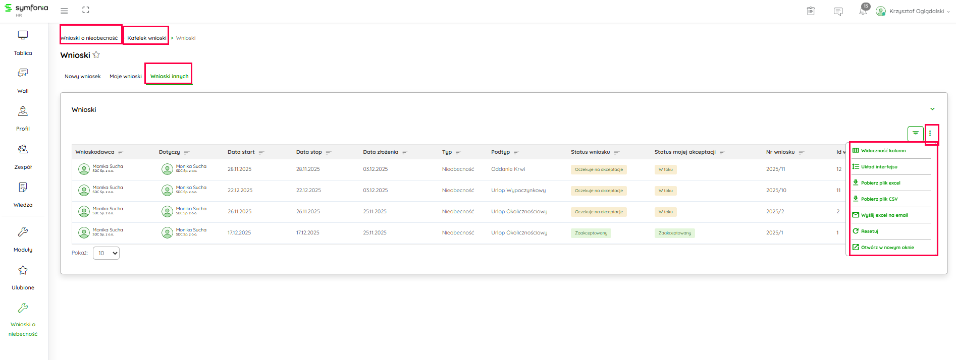 Listę wyświetlonych wniosków o nieobecność możesz łatwo wyeksportować korzystając z dostępnych w Tabeli opcji ukrytych pod ikonką trzech kropek, w prawym górnym rogu.
