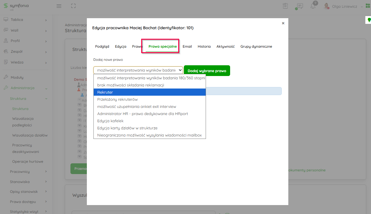 W tej zakładce możesz nadać dodatkowe prawa pracownikowi. Prawa te pozwalają na zarządzanie wybranymi funkcjonalnościami w systemie Symfonia HR.