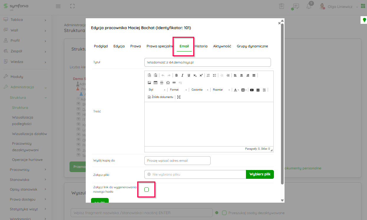 Jeśli użytkownik nie logował się jeszcze do swojego konta, zaznacz pole wyboru z opcją załączenia danych do logowania - "Załącz link do wygenerowania nowego hasła".