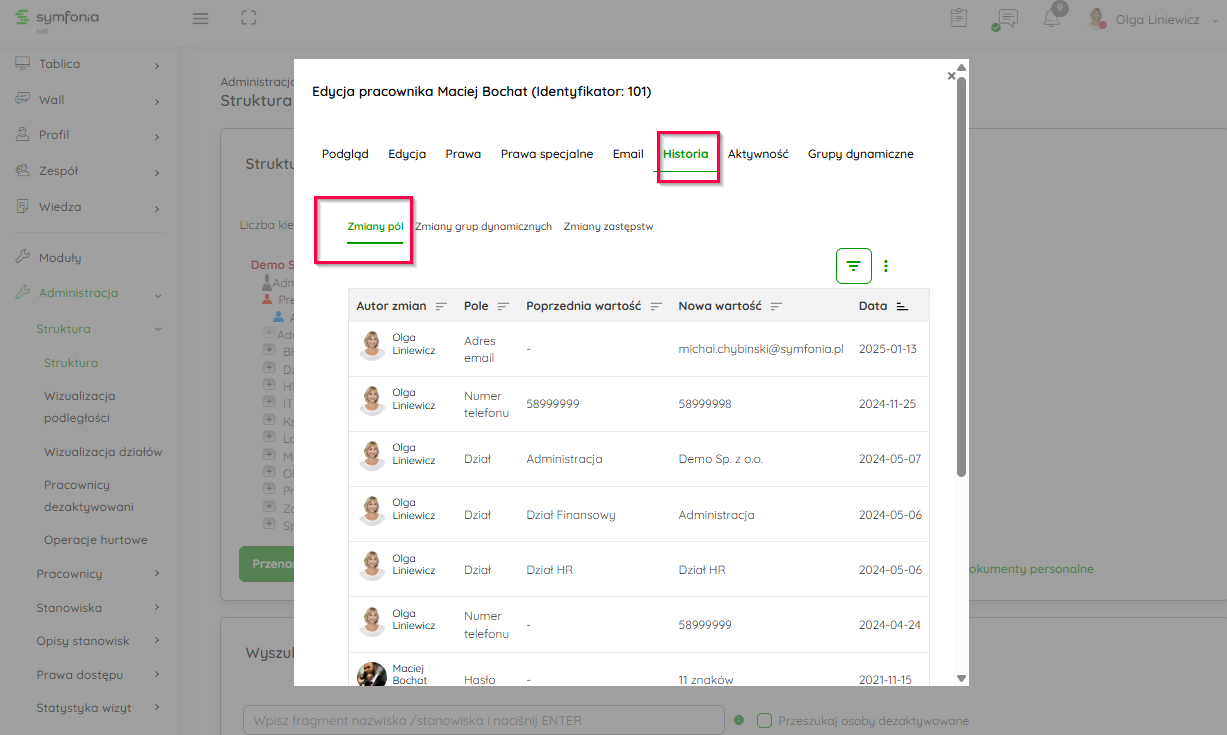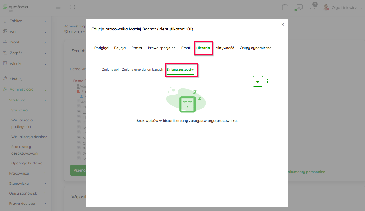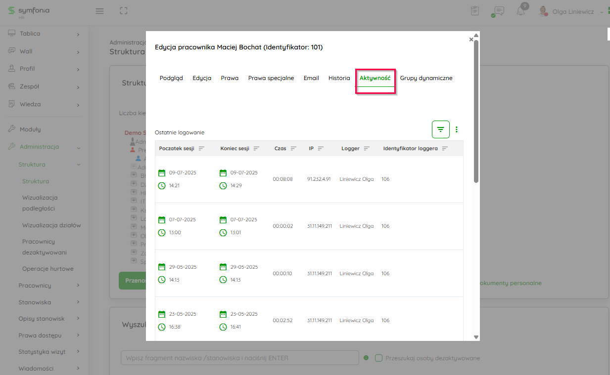 W tej zakładce nadajesz uprawnienia w poziomach 1-3 (opisane w artykule Jakie prawa możesz posiadać w systemie Symfonia HR?). Poniżej masz informacje w logu, kto i jakie zmiany wprowadził.