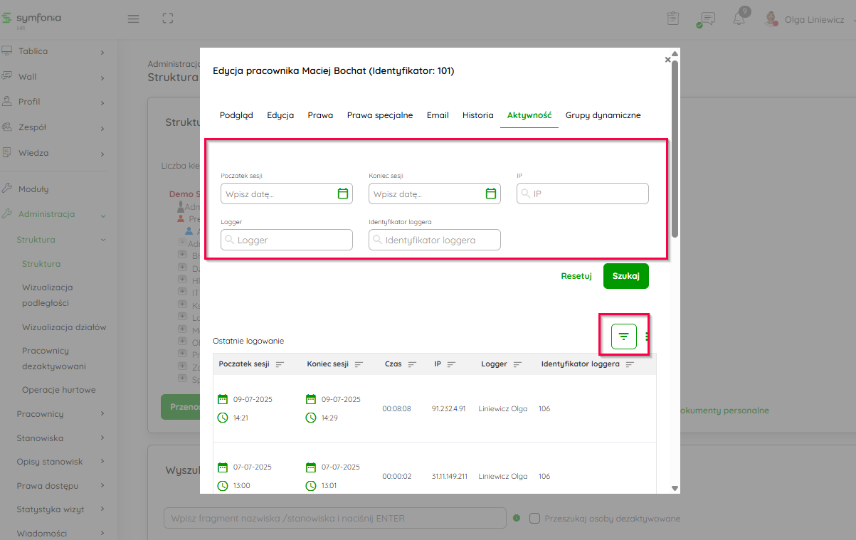 - Historię ostatnich logowań użytkownika (czas, loggera który logował się na konto użytkownika, identyfikator). Dodatkowo, w tej zakładce możesz filtrować i sortować wyniki.