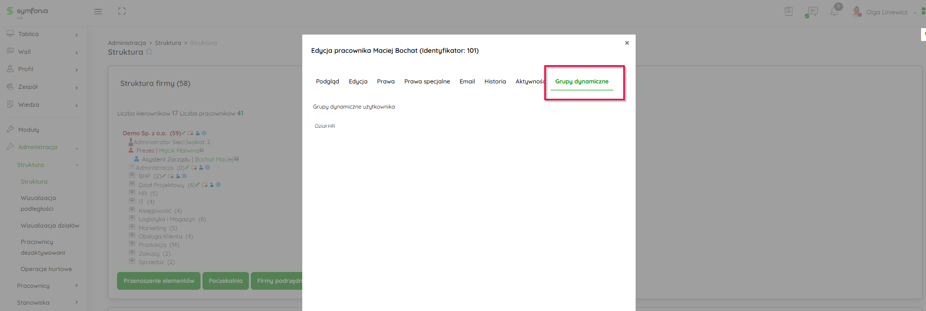 W zakładce Grupy dynamiczne wymienione są wszystkie grupy dynamiczne ( grupy ustalone na podstawie kryteriów tj. przypisania do stanowiska , działu itp.) , do których należy pracownik.