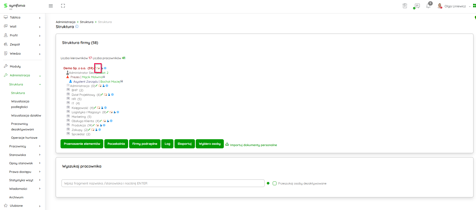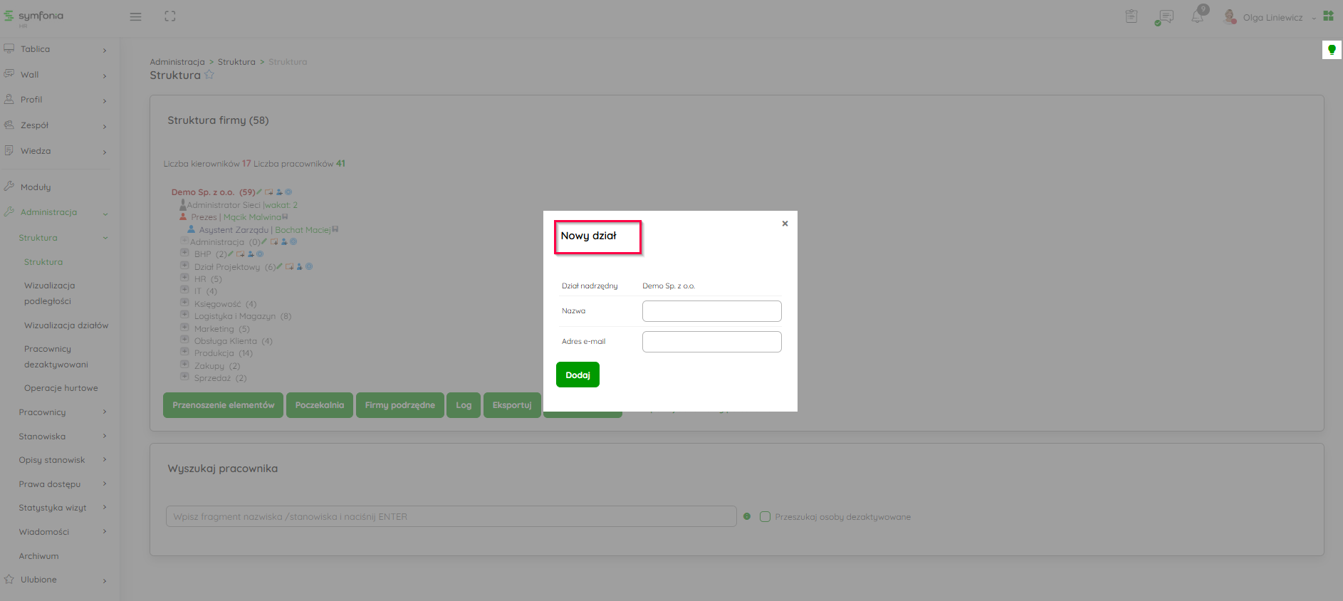• ukryć dział oraz użytkowników z tego działu w kaflu Struktura