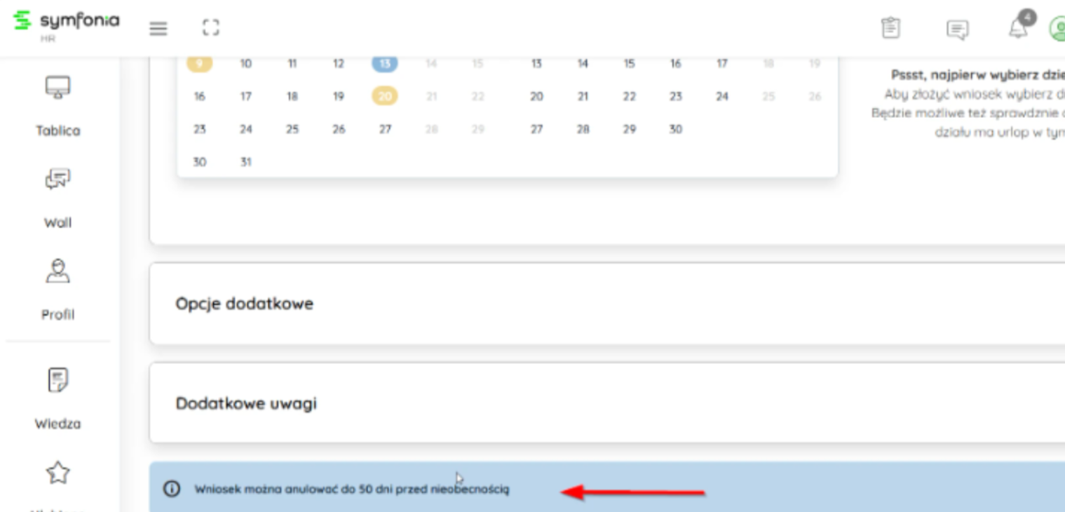 Ty jako Pracownik może anulować wniosek, tylko kiedy od złożenia wniosku do momentu, gdy zostanie 50 dni do nieobecności.
