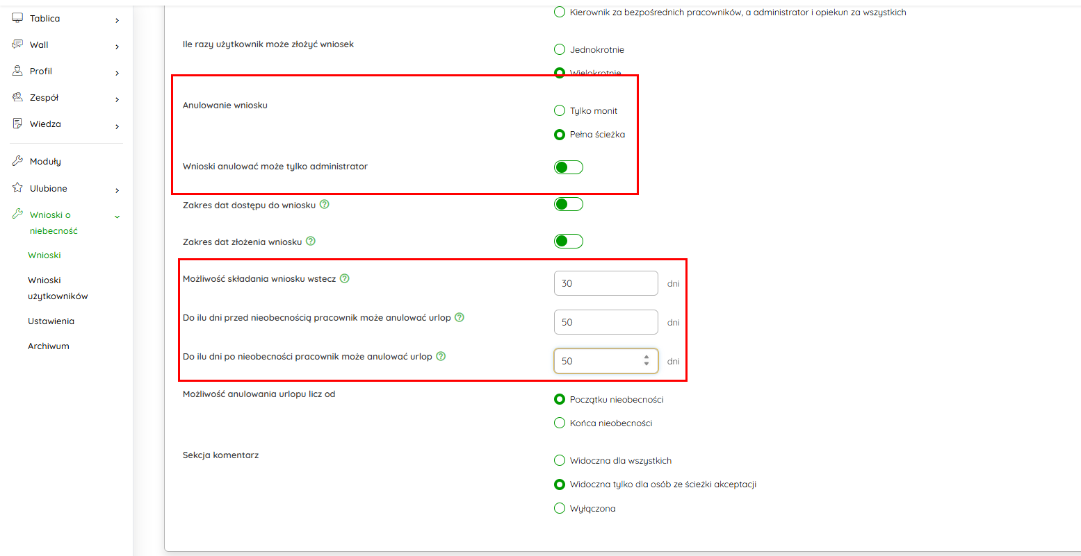 Ustawione jest Do ilu dni przed nieobecnością pracownik może anulować wniosek → 50.